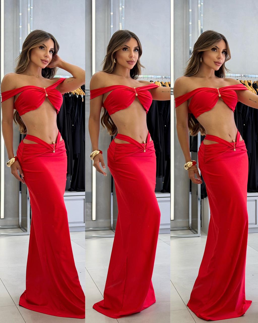 Com modelagem sereia e caimento impecável, o conjunto cria um visual impactante, ideal para quem busca estilo, personalidade e destaque absoluto.