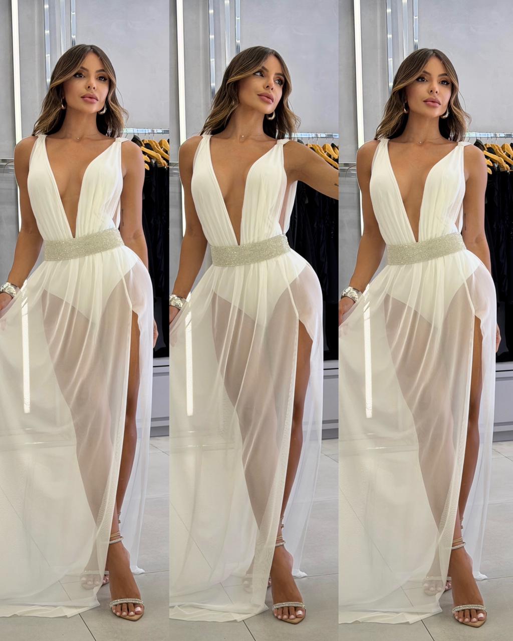 O Vestido Evy é a união perfeita entre leveza e sofisticação. Com decote profundo e caimento fluido, ele cria uma silhueta alongada e elegante que impressiona em qualquer ocasião.