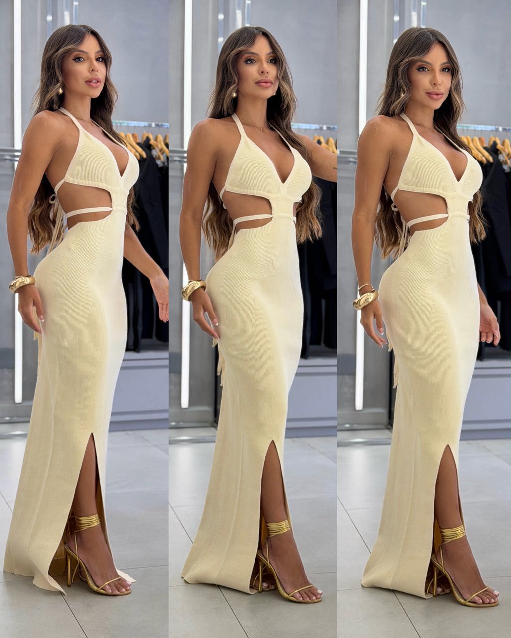 O Vestido Jade Off-White é a escolha perfeita para quem ama elegância com um toque sensual. Com recortes estratégicos na cintura e costas abertas, ele valoriza a silhueta feminina de forma sofisticada. O decote profundo e a fenda frontal garantem movimento e um charme irresistível, ideal para eventos especiais ou ocasiões noturnas.